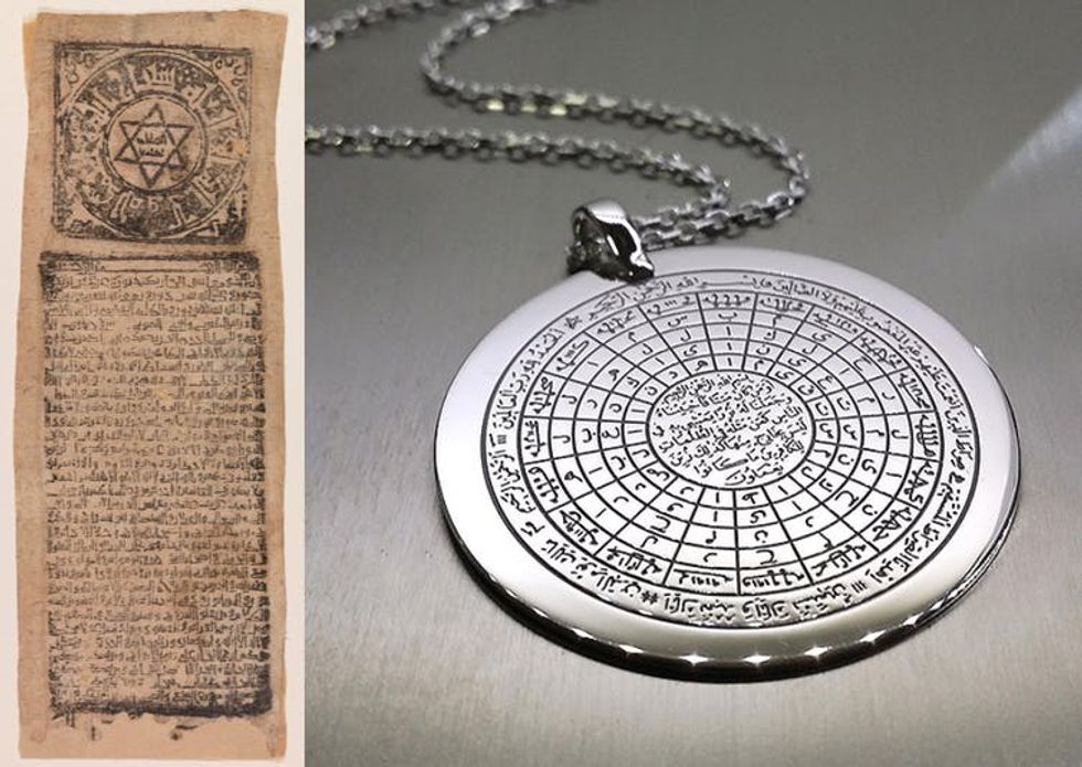 Eleventh-century talismanic scroll from Egypt (left) and pendant with the ‘Garden of Names’ anti-plague amulet for sale online today (right).