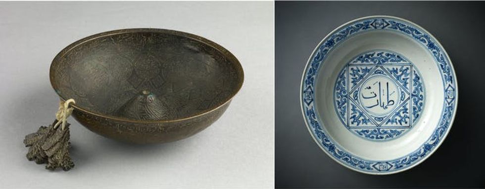 A metal magico-medicinal bowl, left, and a ceramic ablutions basic inscribed with the word ‘taharat,’ meaning purity.