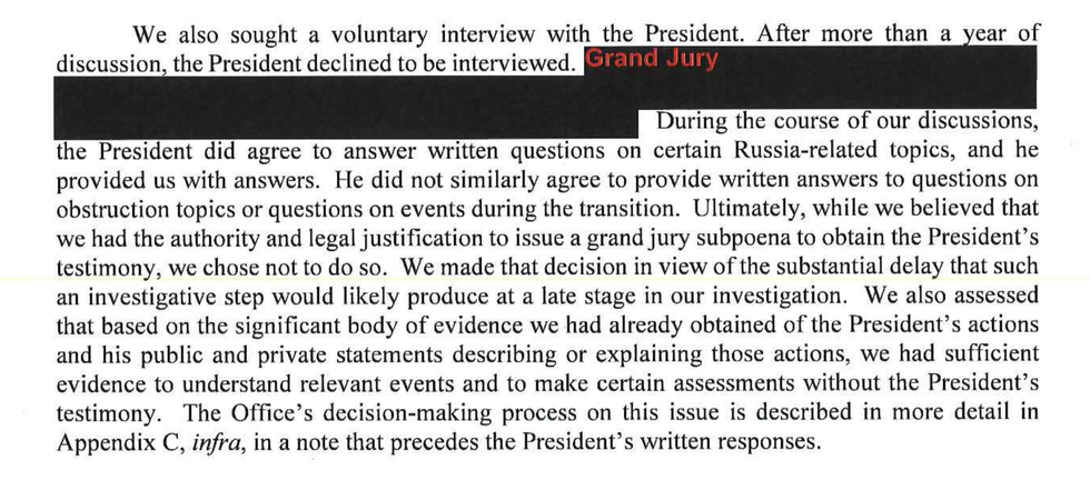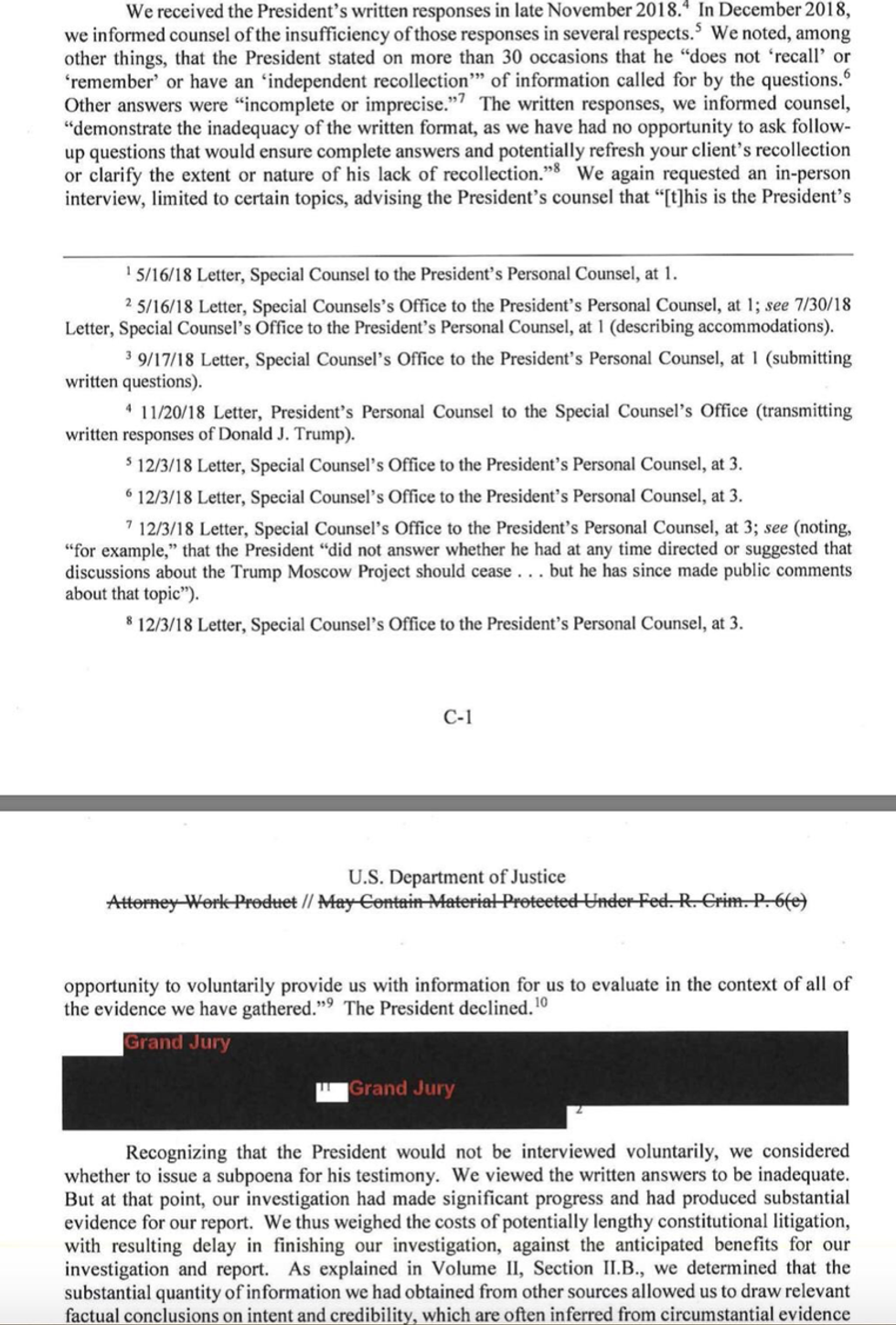 A redacted passage in the report suggests that the grand jury saw Trump's written responses to Mueller's questions — which Mueller ultimately found unsatisfactory and which contained various contradictions and, according to Mueller himself, false statements.