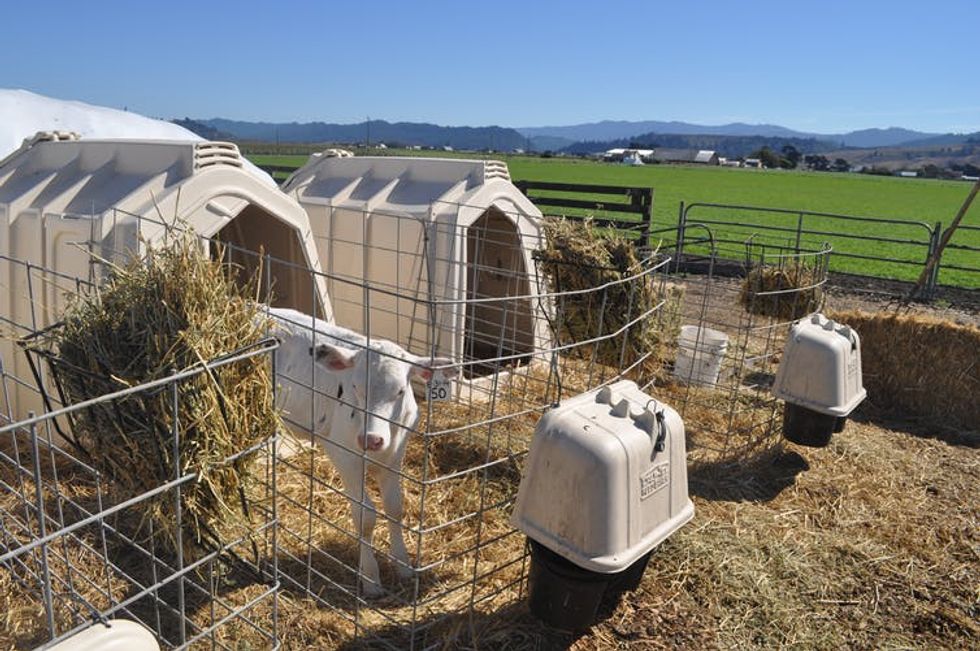A dairy farm in California physically distances individual calves to prevent nose-to-nose contact.