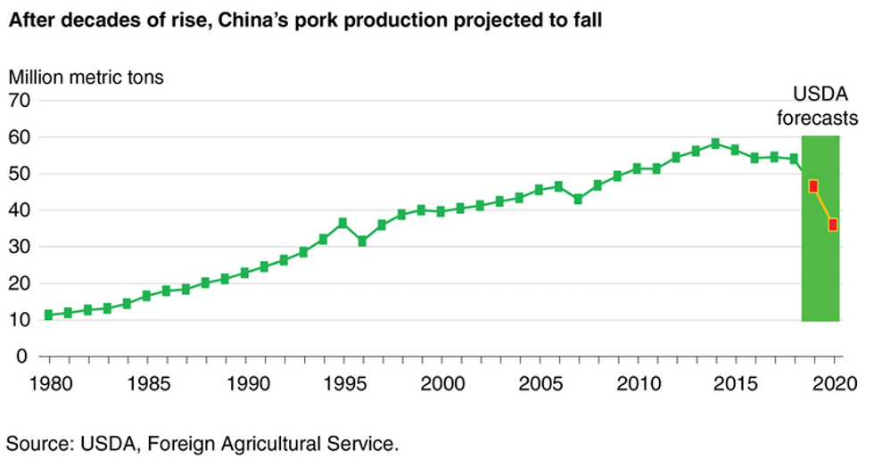 Before the ASF panzootic, China’s pork output was almost five times larger than U.S. production. That output has dropped sharply, doubling the price of pork in China, where it is the nation’s most-consumed meat.