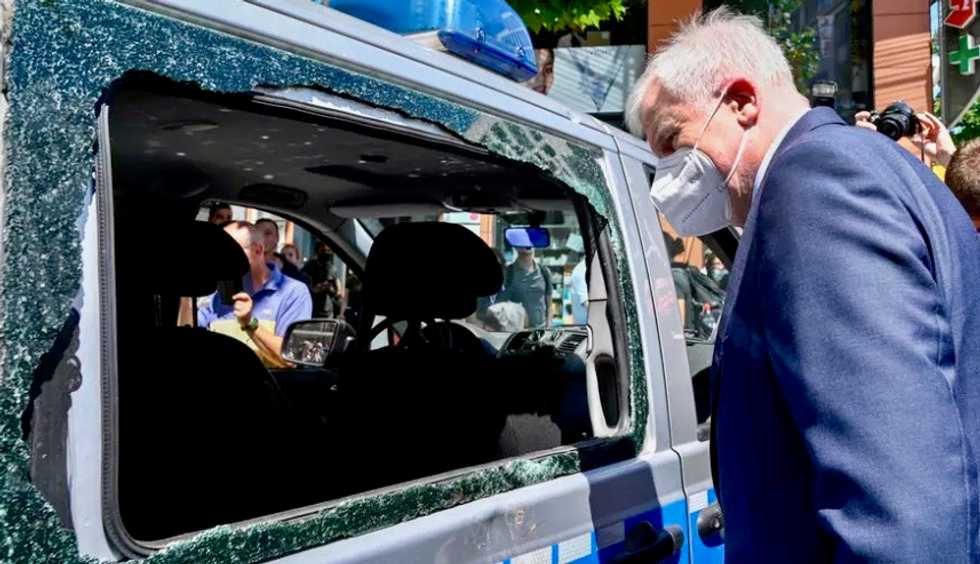 Interior Minister Horst Seehofer travelled to the city on Monday. He paused at a police vehicle with its windows smashed out as he took stock of the trail of destruction.