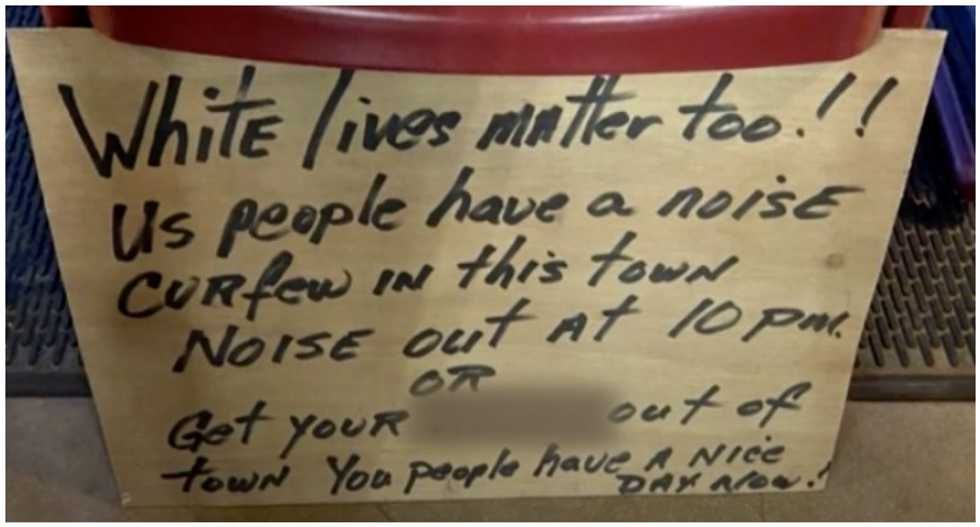 "White lives matter too!! Us people have a noise curfew in this town noise out at 10 pm or get your a**es out of town you people have a nice day now! [sic]," the sign read on the front. On the back, it read, "To the late night A****les Big Mouth up to 2:00 AM [sic]."