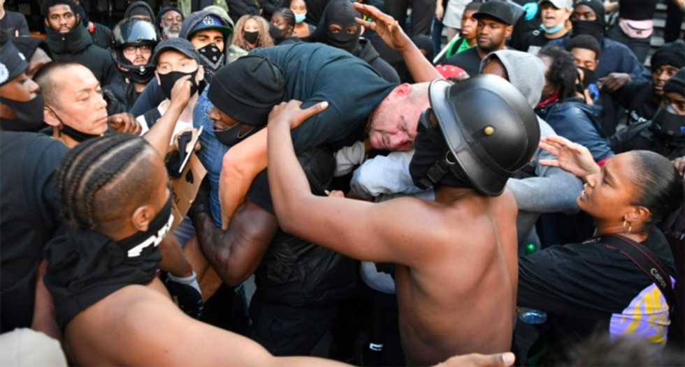 AFP / DANIEL LEAL-OLIVAS An injured man is taken away by police after clashes in Trafalgar Square as protesters supporting the Black Lives Matter movement clash with far-right demonstrators standing against racial equality in central London on June 13, 2020