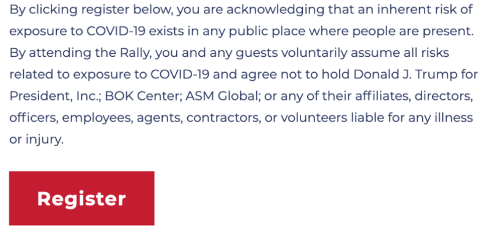 "By clicking register below, you are acknowledging that an inherent risk of exposure to COVID-19 exists in any public place where people are present. By attending the Rally, you and any guests voluntarily assume all risks related to exposure to COVID-19 and agree not to hold Donald J. Trump for President, Inc.; BOK Center; ASM Global; or any of their affiliates, directors, officers, employees, agents, contractors, or volunteers liable for any illness or injury," the legal notice reads.