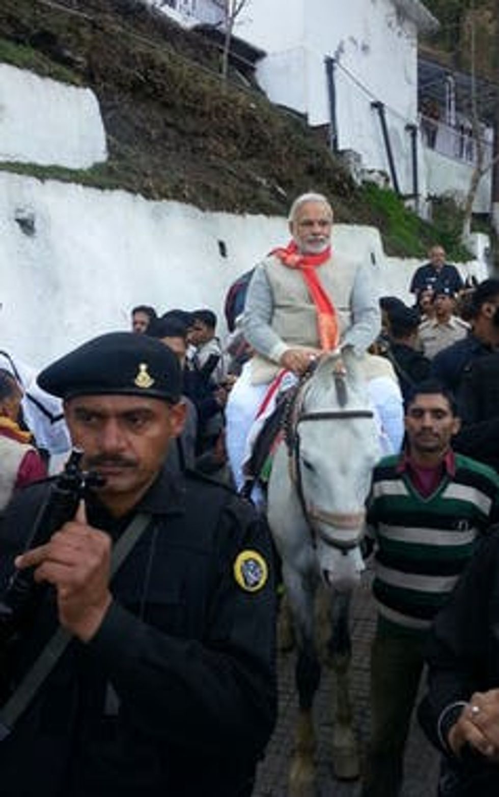 Then-prime minister candidate Narendra Modi visits a shrine on horseback while electioneering in 2014.