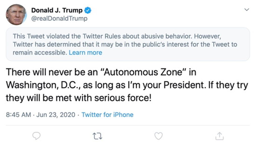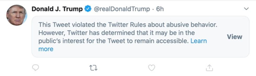 The warning appended to Trump's tweet reads: "This Tweet violated the Twitter Rules about abusive behavior. However, Twitter has determined that it may be in the public’s interest for the Tweet to remain accessible."