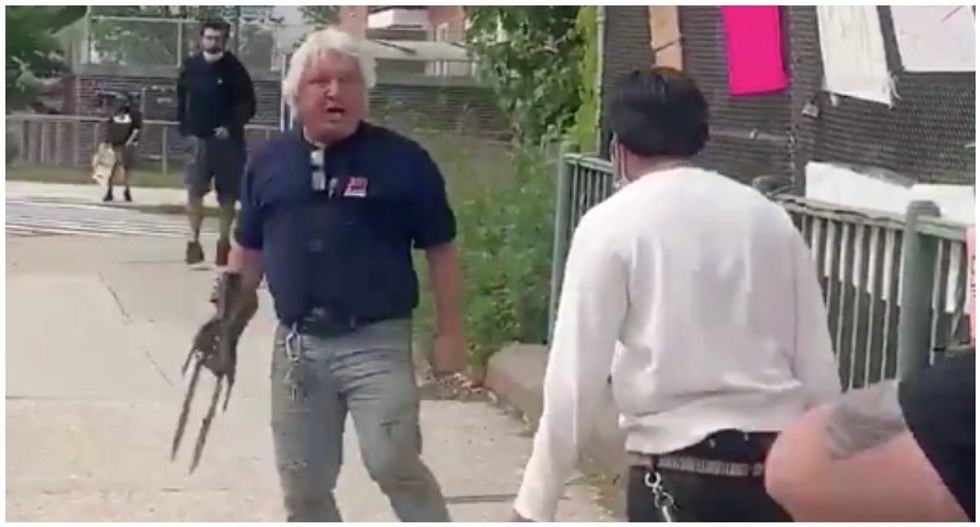 In a wild moment that was caught on video, a New York man can be seen emerging from his truck to confront protesters, armed with some sort of multi-pronged blade contraption attached to his arm.