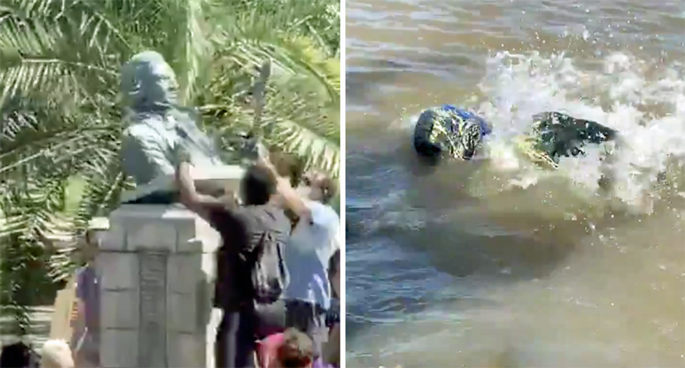 "Two people have been apprehended and taken to New Orleans Police headquarters after a group of protesters took down the bust of John McDonogh in Duncan Plaza and tossed it into the Mississippi River on Saturday," NOLA.com reports. "The bust was taken down after the Take Back Pride Motorcade rally, where hundreds of cars and bicycles rolled through New Orleans to protest police brutality, systemic racism, violence against black trans people, discrimination and other issues."