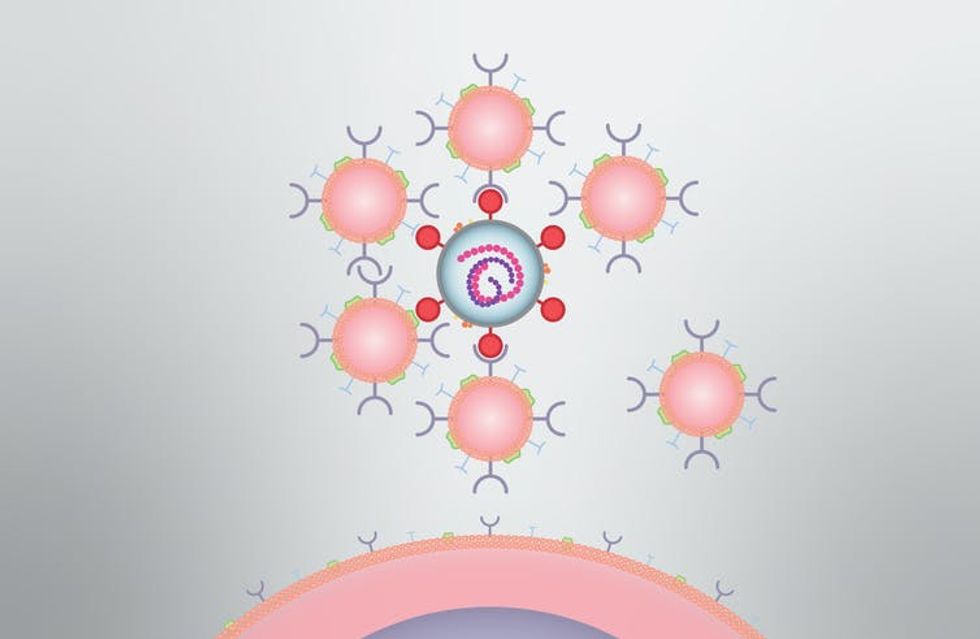 To make the decoys, we collect the outer membranes of the lung or immune cells and wrap them around a core made of biodegradable nanoparticles. From the outside the decoys look the same as the human cells they are impersonating. Our decoys are hundreds of times smaller in diameter than an actual lung or immune cell, but they have all the same cellular hardware sticking out of them.