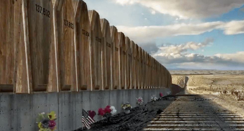 As the camera zooms in on the wall, we see it isn't the steel-slat fence Trump is building along the border with Mexico, but is actually a wall of coffins with each one sequentially numbered.