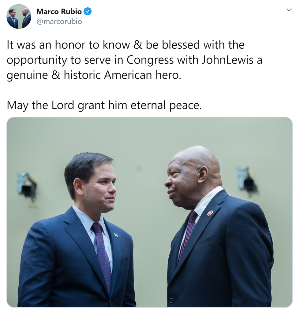 There was just one problem: The congressman Rubio is talking to in the picture he tweeted out isn't John Lewis. It's Elijah Cummings, the former Baltimore congressman who chaired the House Oversight Committee and passed away last October.