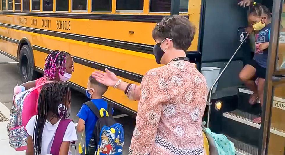 Video shared by WDRB reporter Kevin Wheatley shows elementary school students with masks packed onto a bus. One student can be seen wearing a mask incorrectly. Most of the students appear to be Black.