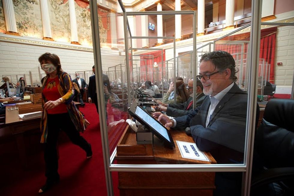 When the Rhode Island General Assembly returned on June 17, 2020, plexiglass separated the desks as a coronavirus precaution. Republican Rep. Michael Chippendale was among members without a mask on.