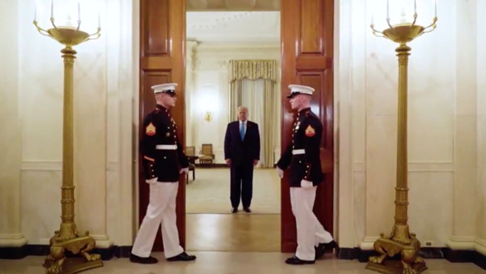 Here's the White House's video. It's unclear why it needed to begin with the members of the military opening the doors for Trump, or him walking into the room.