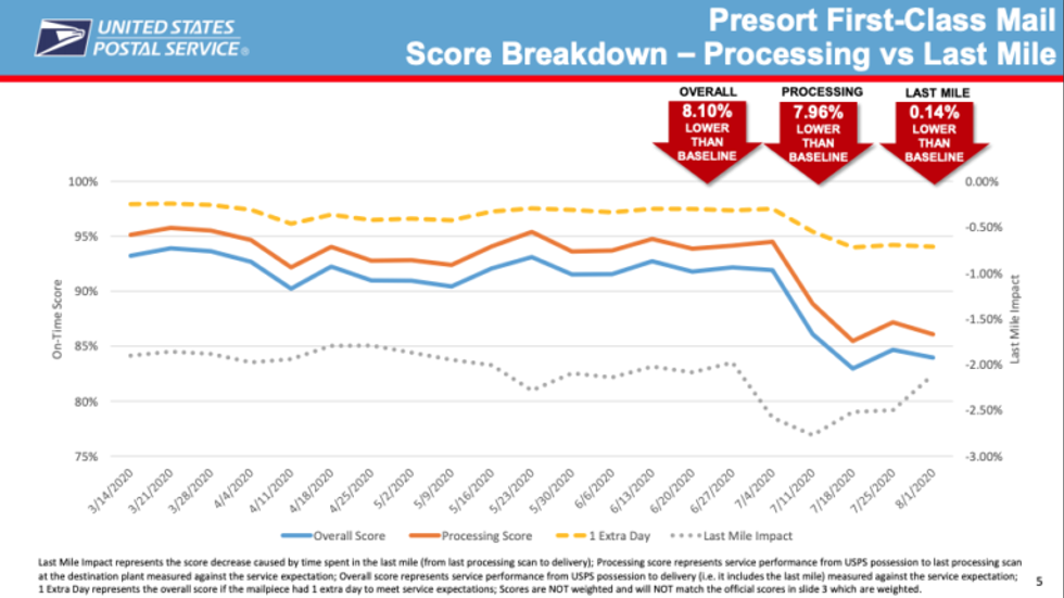 "The new documents being released by the Committee today are part of a “PMG Briefing”—a presentation prepared directly for the Postmaster General last week, on August 12, 2020. They provide a detailed assessment of service performance trends over the past year. According to these documents, there has been a significant drop in service standards across the board since the beginning of July—including in First-Class, Marketing, Periodicals, and Priority Mail," the Oversight Committee explained.