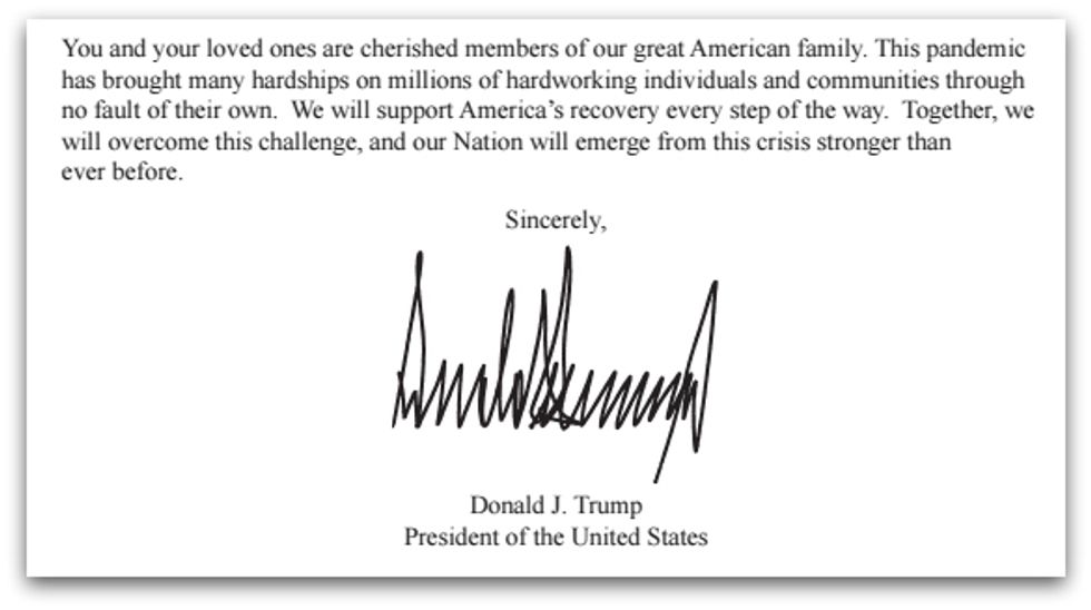 "This pandemic has brought many hardships on millions of hardworking individuals and communities through no fault of their own," reads Trump's note, which encourages recipients to adhere to basic Covid-19 precautions that the president himself has publicly flouted. "We will support America's recovery every step of the way. Together, we will overcome this challenge, and our Nation will emerge from this crisis stronger than ever before."