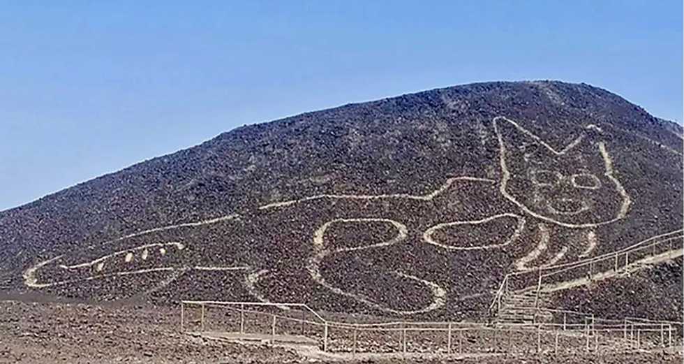 A group of archeologists took on the job of cleaning and preserving the geoglyph, which shows a cat with its body in profile but its head front on.