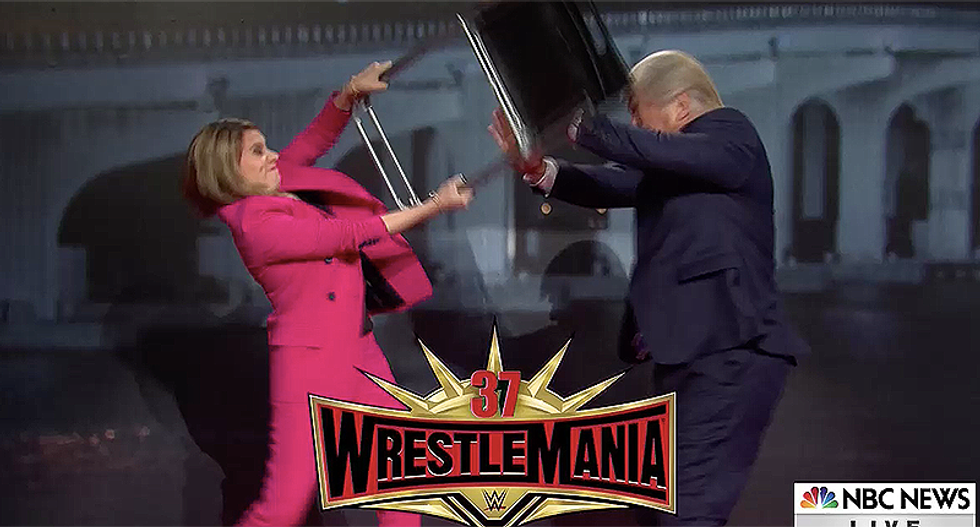When it flipped back to the Trump rally, Guthrie and Trump were attacking each other like a Wrestle Mania style-death-match in which she distracted him only to smash his face in with a chair.