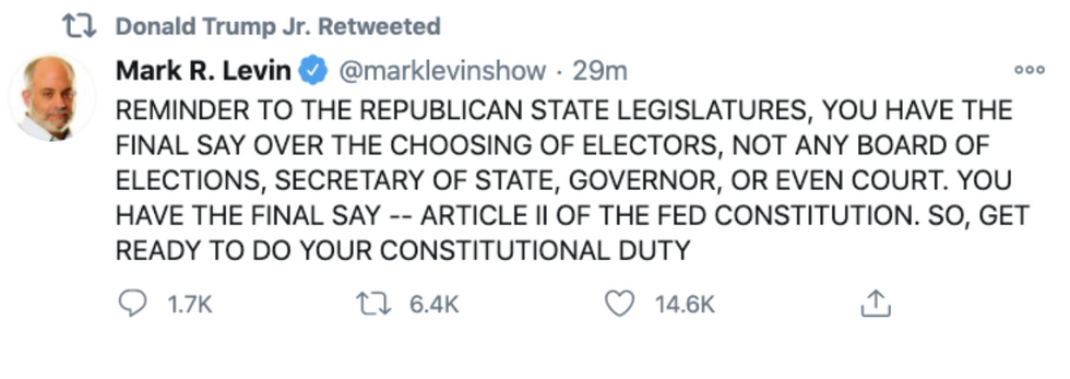 In response to this dismal situation for the president, far-right radio host Mark R. Levin responded with a tweet suggesting a plan to overturn the results. Mother Jones' Tim Murphy denounced the idea as an authoritarian idea for trying to steal the election if Biden is declared the winner, and Murphy noted that Donald Trump, Jr. has signed off on Levin's idea.