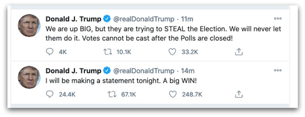 With the battle over crucial electoral college votes still potentially days or even weeks away—and just after Democratic nominee Joe Biden spoke to the nation in a televised address to urge patience for official results—Trump, just before 1:00 am ET, tweeted he would be "making a statement tonight" and then called it "a big WIN!"