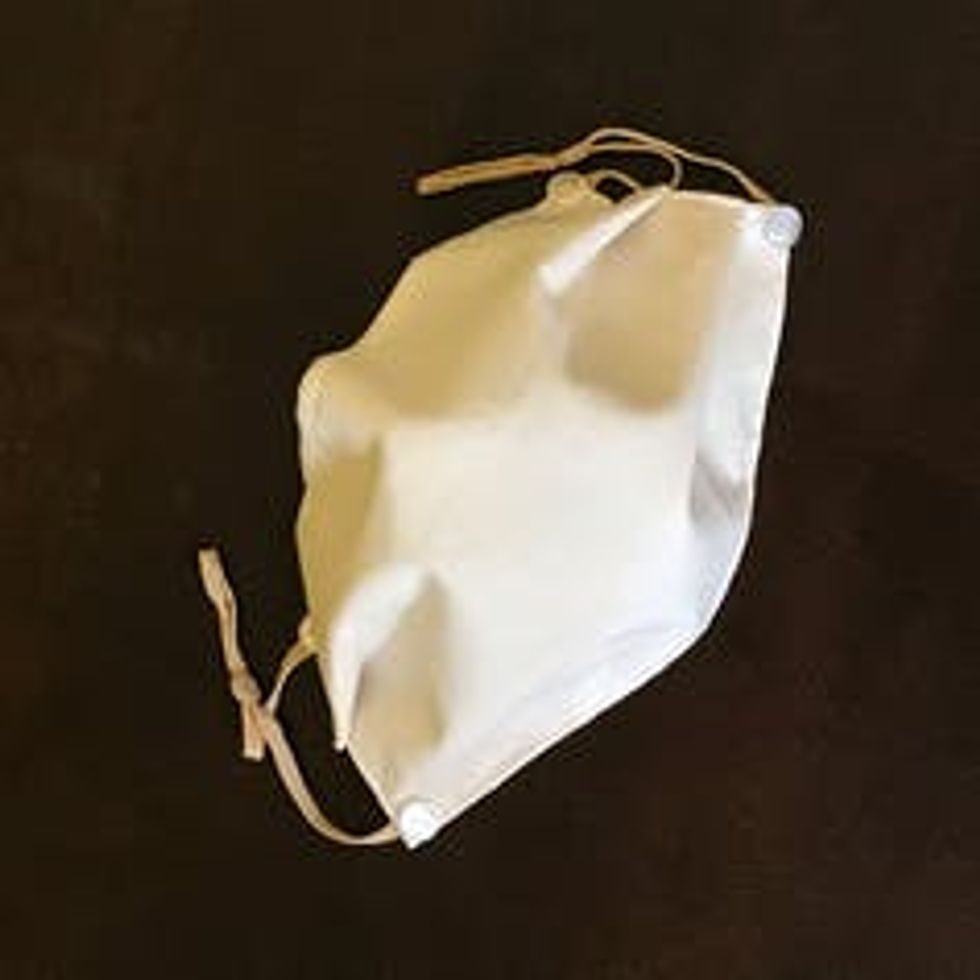 A three-layer pleated mask using cotton outer layers and a fully-integrated middle layer of 68 gsm (two ounces per square yard) polypropylene. The mask is quite structured but comfortable, because of the cotton, and completely washable.