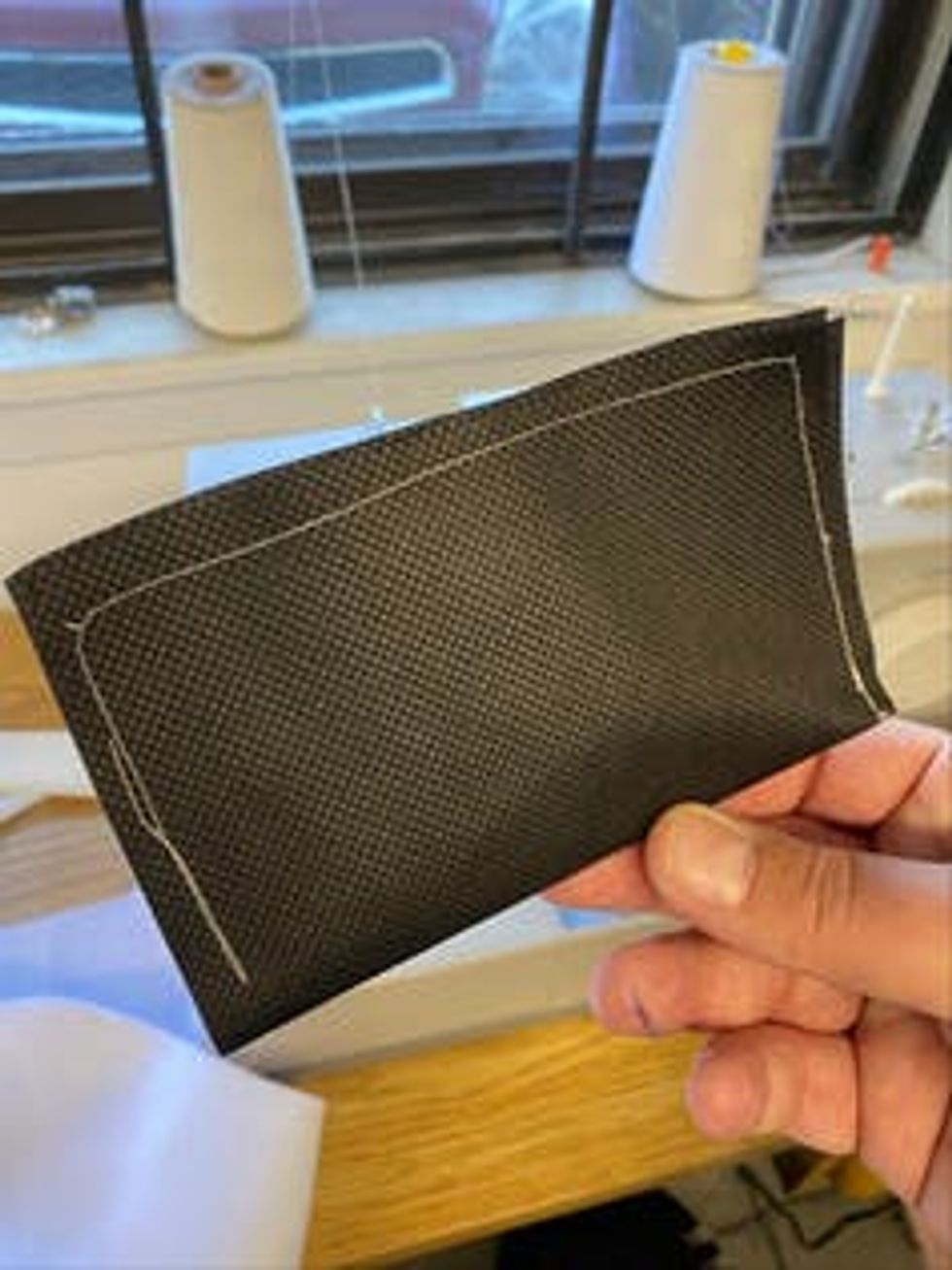 Two layers of black industry-grade spunbond sewn to make a washable filter.