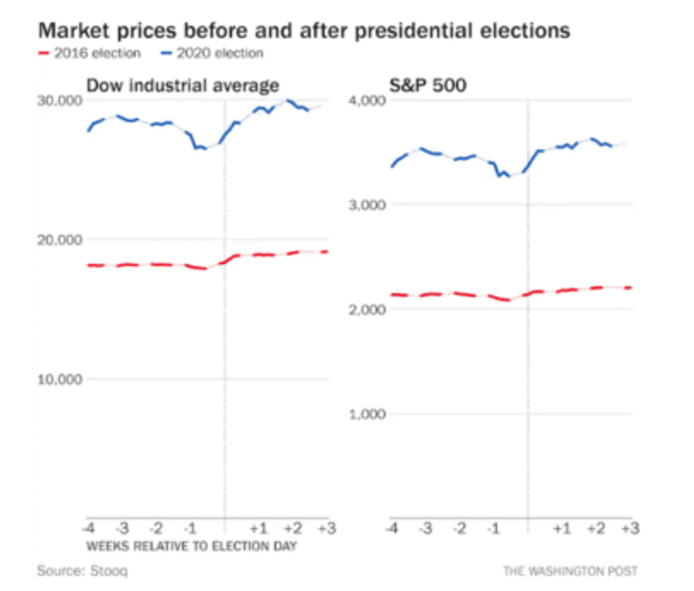 "From a week before the 2016 election to three weeks after — where we are now, relative to this year’s contest — the Dow Jones industrial average gained 1,084 points, and the S&P 500 was up 92.94 points," the Post explained. "From a week before Nov. 3 of this year until the markets closed Monday, the Dow was up almost twice as much — 2,128 — and the S&P up more than twice as much."