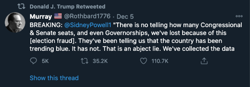 President Donald Trump retweeted a conspiracy theory from his former lawyer Sidney Powell claiming a slew of House and Senate seats were likely lost along with the presidency.