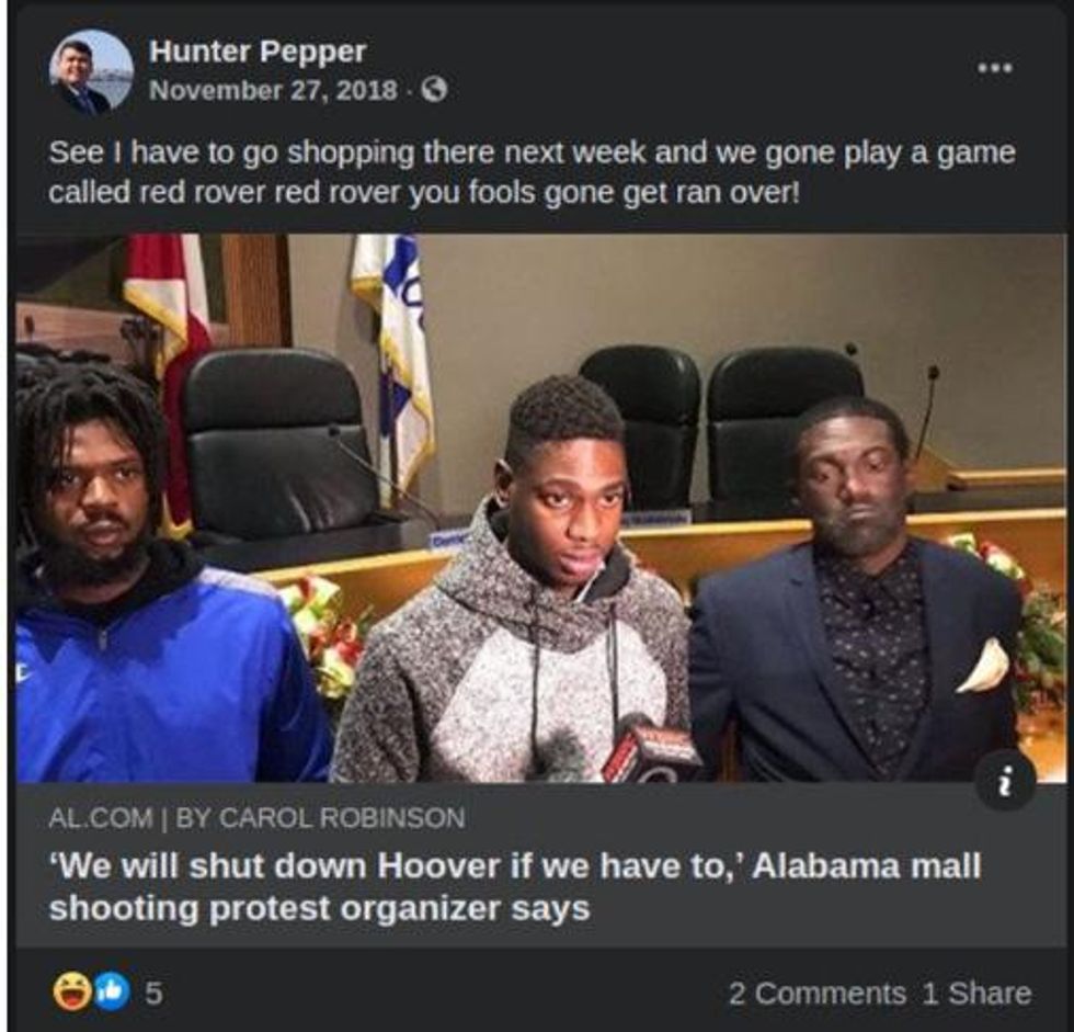 The controversial post was first reported by BamaPolitics this week. Responding to a news report about protesters threatening to shut down a mall over the police shooting of E.J. Bradford, Pepper wrote in 2018: "See I have to go shopping there next week and we gone play a game called red rover red rover you fools gone get ran over!"