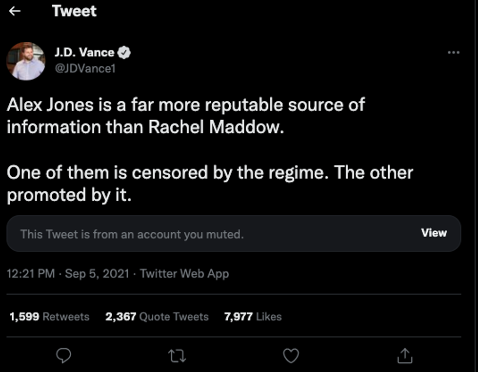 The verdict brought back comments from one Senate candidate, J.D. Vance, who is running in Ohio against Rep. Tim Ryan (D-OH). In 2021, Vance said that Jones was "far more reputable" than MSNBC host Rachel Maddow.