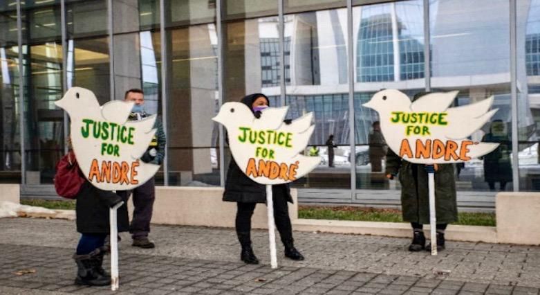 Protesters hold signs outside a courthouse in Columbus, Ohio, calling for justice for Andre Hill