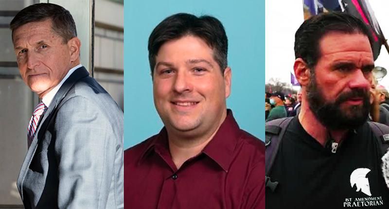 From left to right: Former national security adviser Michael Flynn (Saul Loeb/AFP), Jim Penrose (Linkedin profile) and 1AP member Robert Patrick Lewis (screenshot/ NTD)