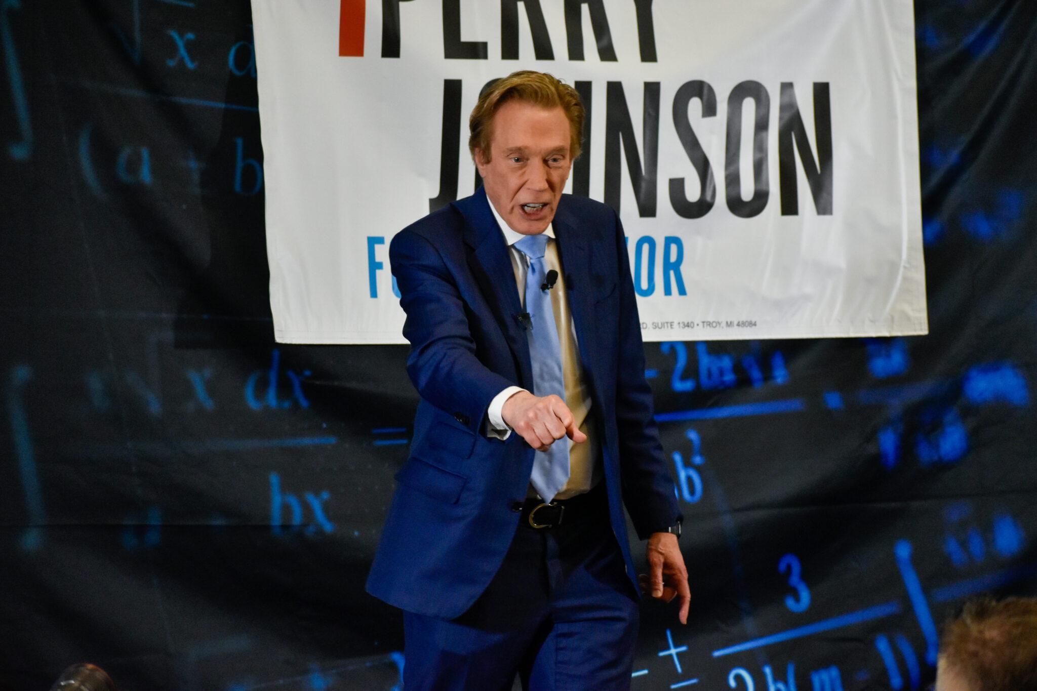 Republican gubernatorial candidate Perry Johnson holds a campaign kick-off event in Lansing on Feb. 23, 2022. (Andrew Roth | Michigan Advance)