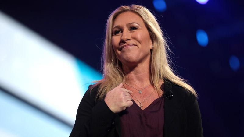 Congresswoman Marjorie Taylor Greene speaking with attendees at the 2021 AmericaFest. (Gage Skidmore)