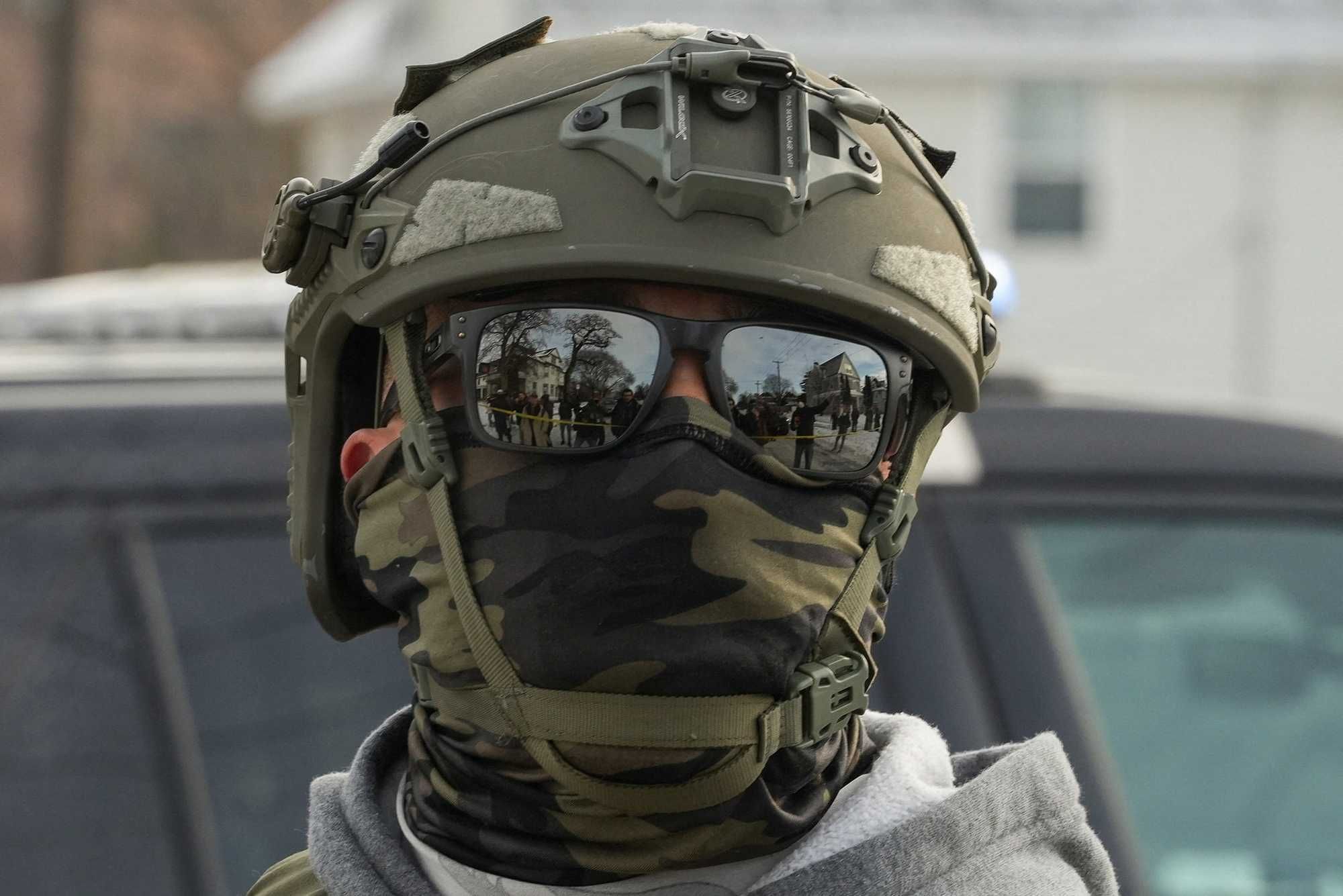 People are reflected in a federal agent's sunglasses in Minneapolis. REUTERS/Tim Evans