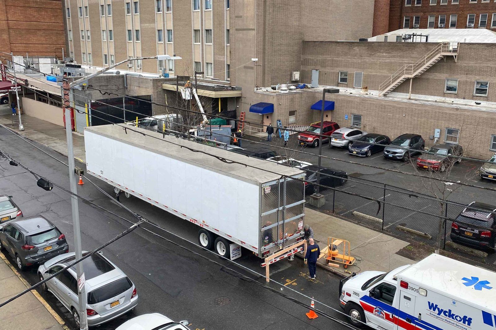 A refrigerated truck outside Wyckoff Heights Medical Center. (Courtesy of Marc Kozlow)