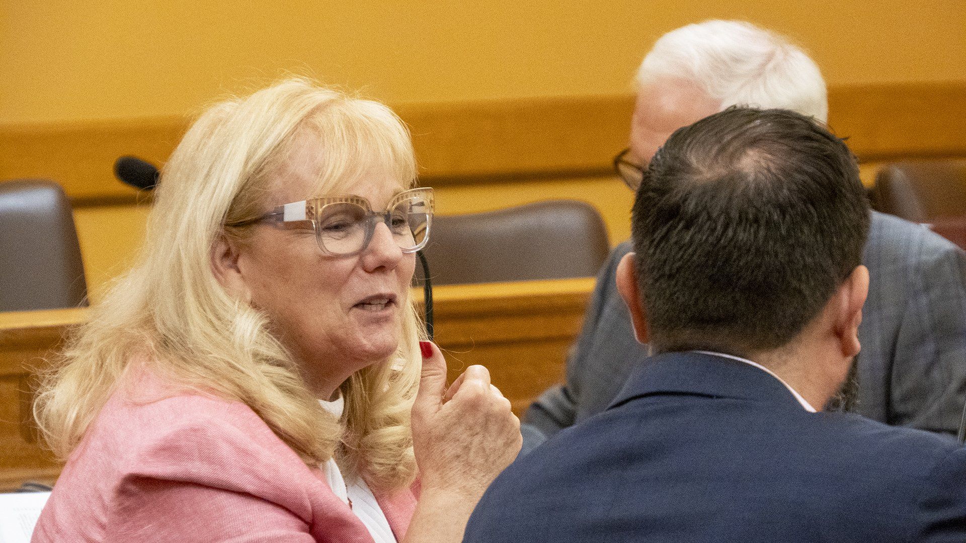 Rep. Susan Concannon, R-Beloit, confers with colleagues during an April 2, 2024, conference committee hearing. (Sherman Smith/Kansas Reflector