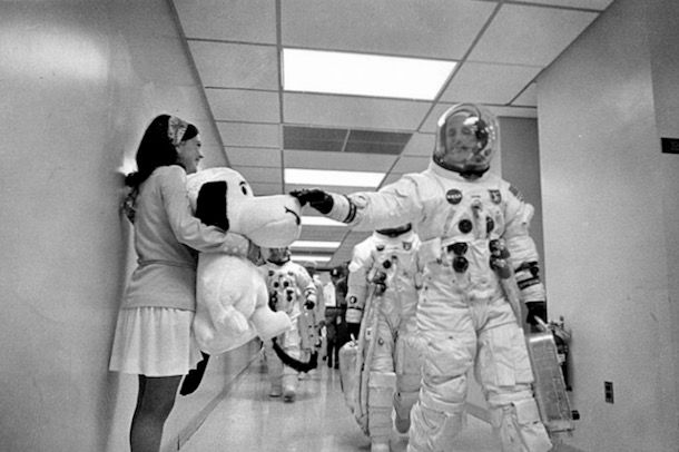 In this May 1969 image obtained from NASA, astronaut Tom Stafford, wearing his spacesuit, is being shown a pennant bearing the Peanuts comic book character Snoopy at the Kennedy Space Center in Florida"Kind of a buggy feeling -- you're going somewhere you couldn't see," he said with a laugh.