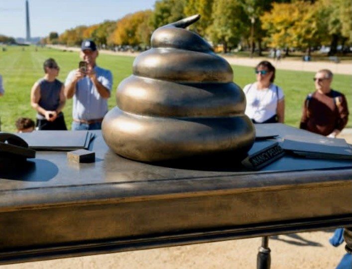 A strange new monument was installed in Washington: a replica of former House speaker Nancy Pelosi's desk, with a large, emoji-style turd sitting atop it.