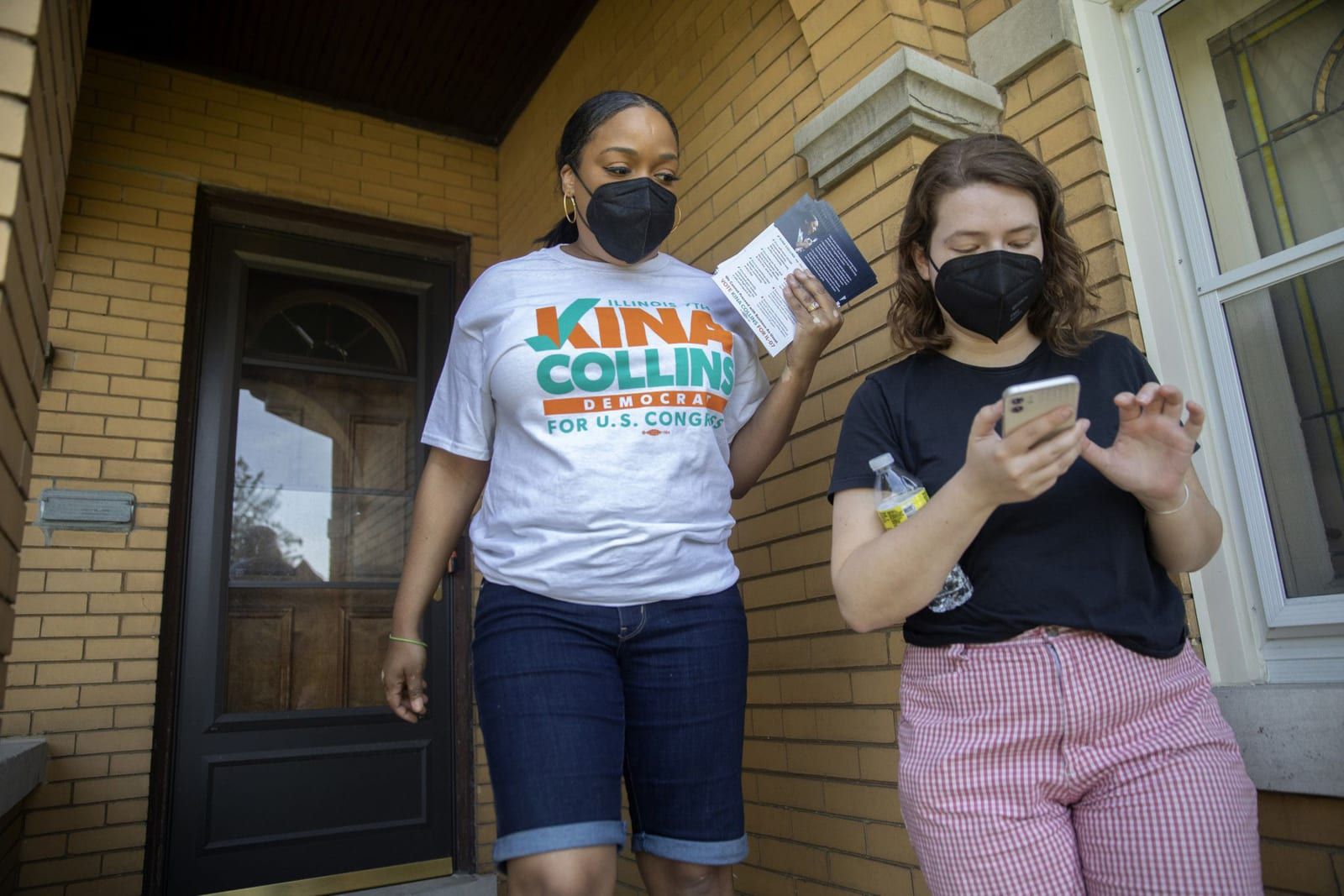 Challenger Kina Collins, left, campaigns door-to-door with her manager, Isabel Alter, on May 29, 2022, in Chicago's Galewood neighborhood. - Erin Hooley/Chicago Tribune/TNS