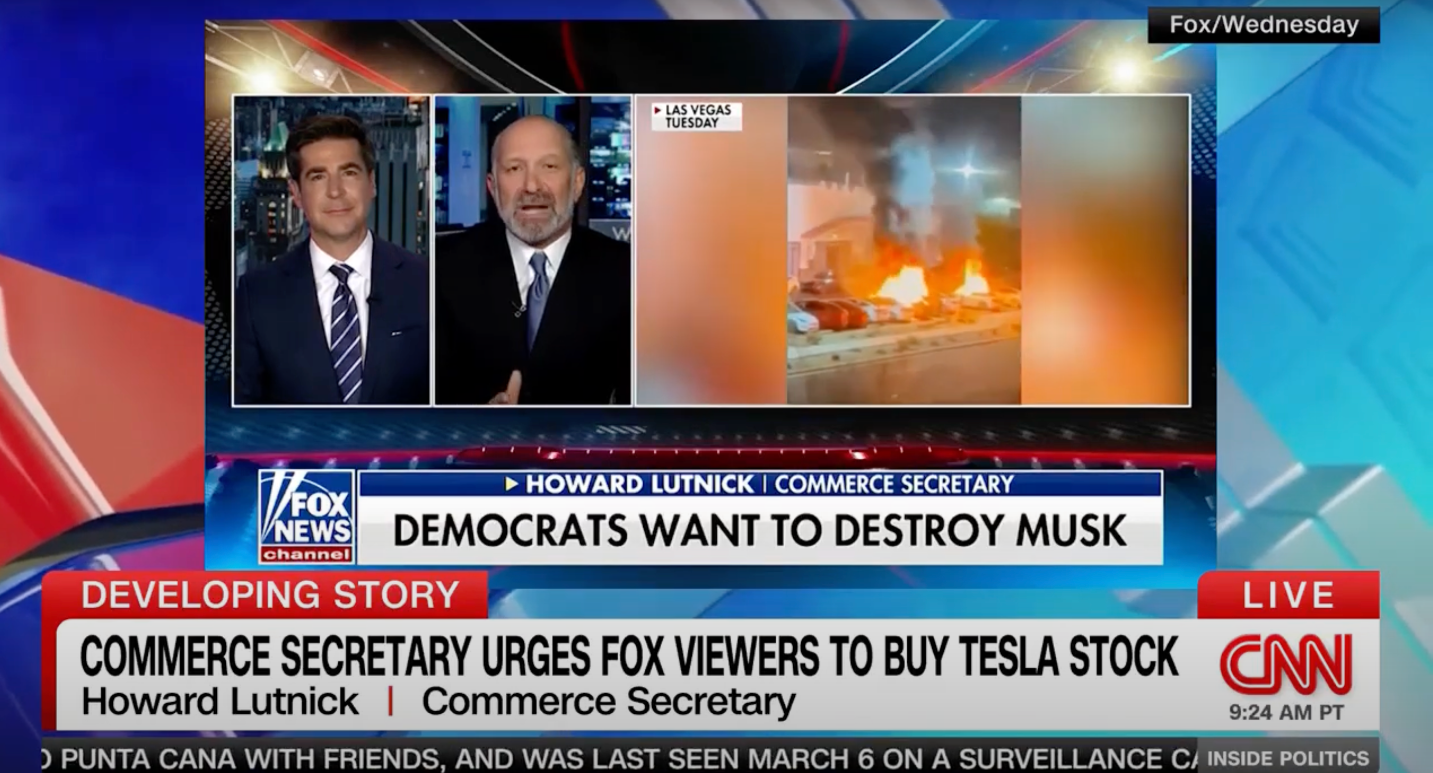 As Lutnick gave a full-throated endorsement of Tesla, vehicles were seen smoldering, set ablaze by Musk protesters throwing Molotov cocktails in Las Vegas.