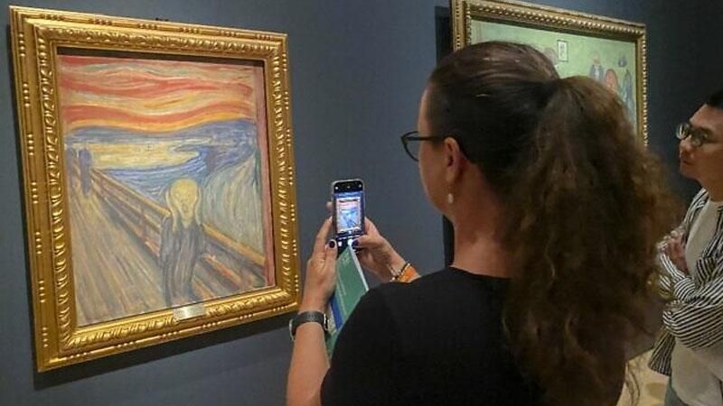 The iconic painting from 1893, now a symbol of existential angst, depicts a humanlike figure standing on a bridge, clutching its head in apparent horror against the backdrop of a swirling sky.