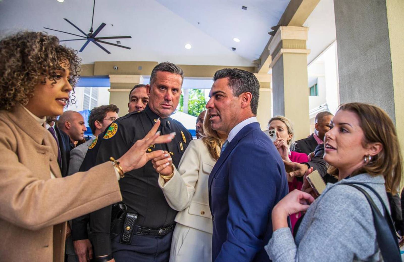 Stephanie Severino, left, director of communications for Miami Mayor Francis X. Suarez, center right, shields the mayor from Herald reporter Tess Riski, right, after his State of the City address. - Pedro Portal/Miami Herald/TNS
