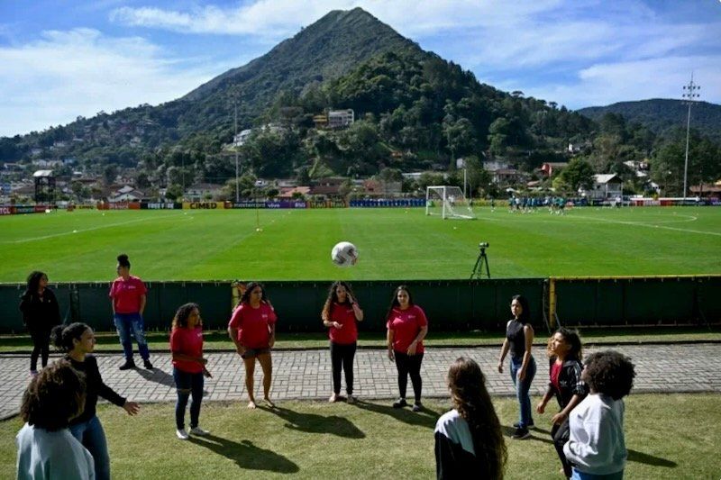 Girls play soccer as the Brazilian women's national team train at their Granja Comary base in Teresopolis, near Rio de Janeiro State (Mauro PIMENTEL)