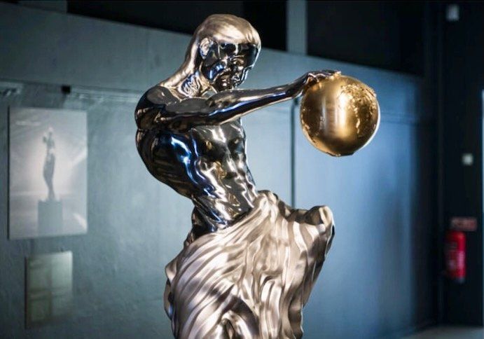 Shaking up traditional conceptions about creativity and art, the stainless steel statue depicts an androgynous person with the lower half of the body covered by a swath of material, holding a bronze globe in one hand.