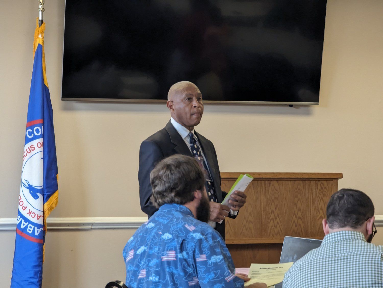 Before establishing quorum, Alabama Democratic Party Chair Randy Kelley and Joe Reed, chair of the Minority (Black) Caucus, attempted to stop attendees from recording the meeting. Kelley repeatedly asked that people unplug their devices, and Reed threatened to throw recording devices outside.