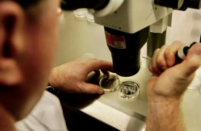 An embryologist examines a dish with human embryos under a microscope (Sandy Huffaker/AFP)