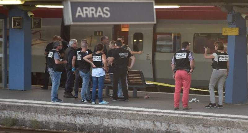 Crime and forensic investigators stand on a platform next to a Thalys train of French national railway operator SNCF at the main train station in Arras, northern France, on Aug. 21, 2015. Photo by Philippe Huguen for Agence France-Presse.