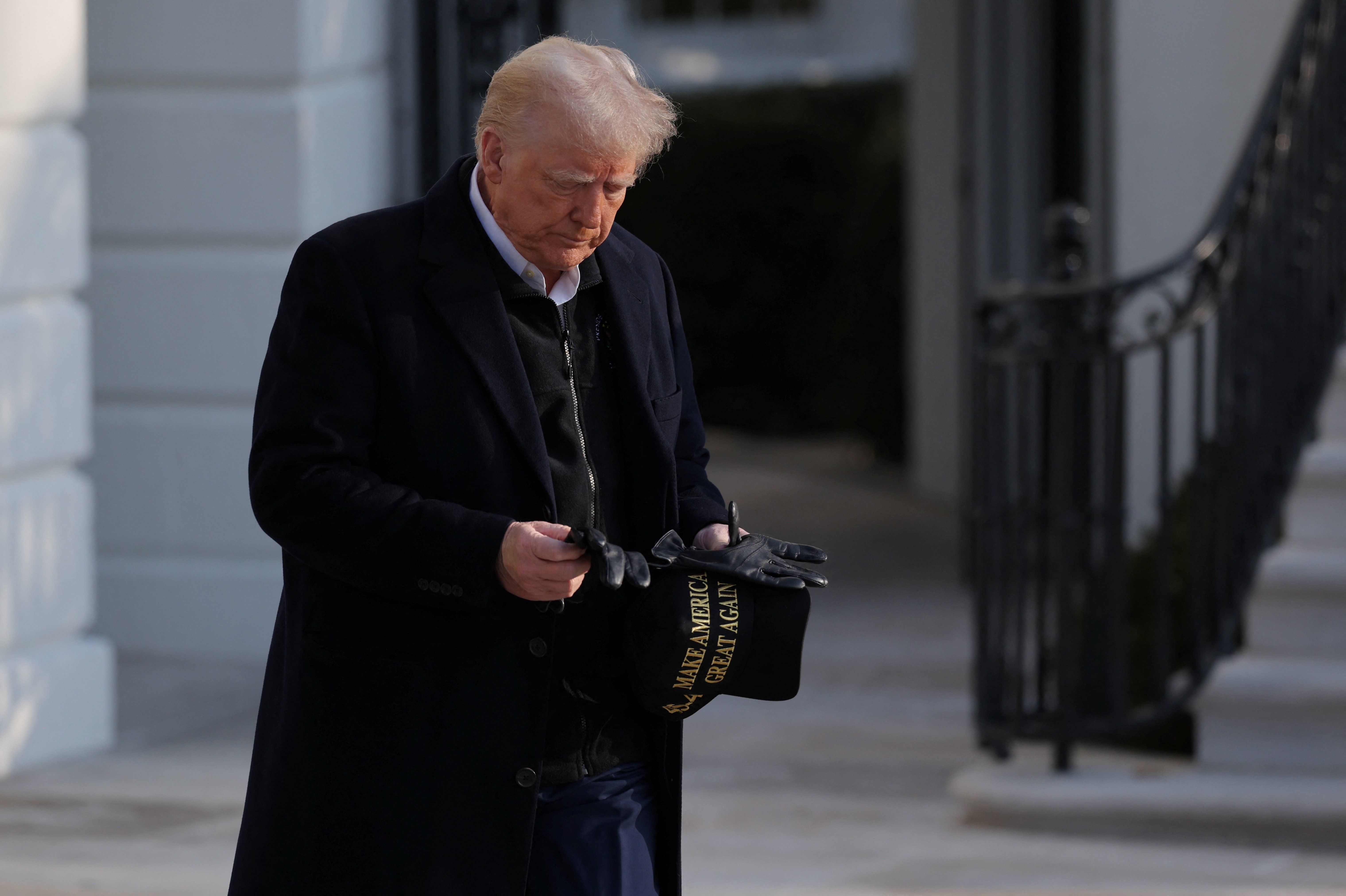 U.S. President Donald Trump holds a black MAGA hat as he departs the White House during his first trip as the new president, in Washington, U.S., January 24, 2025. REUTERS/Carlos Barria